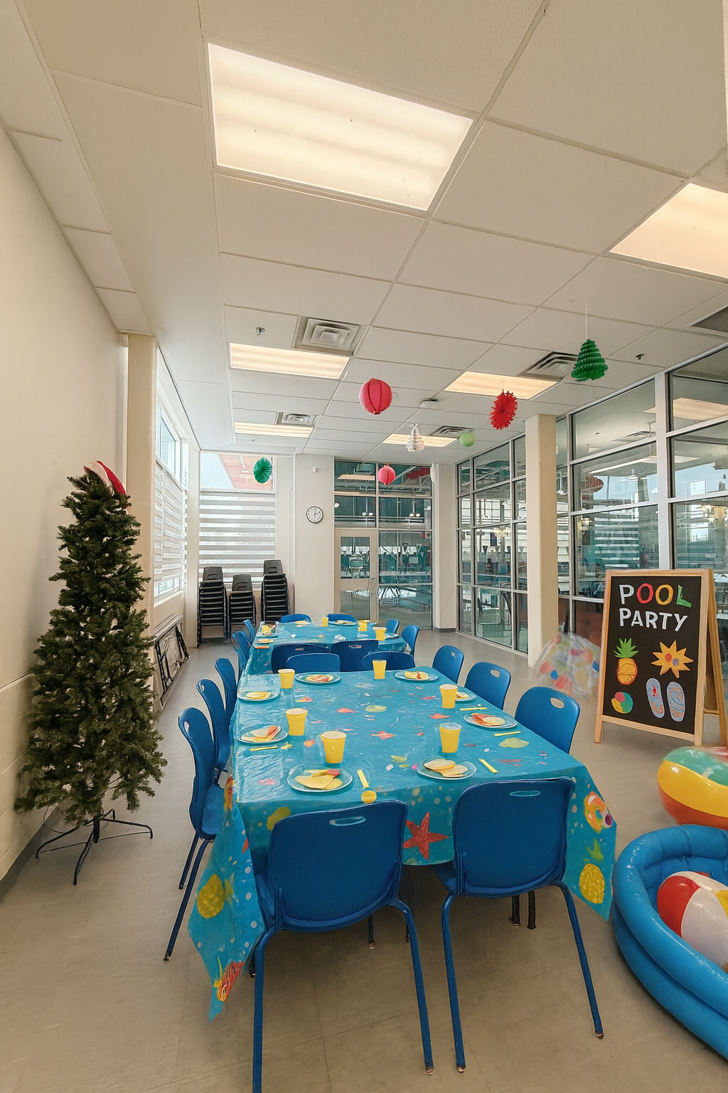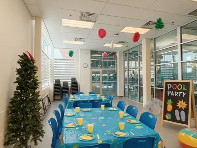 Located on the main floor with convenient direct access to the pool deck, the Party Room is an ideal space for birthday parties, family gatherings, and small events. This room accommodates up to 20 people and includes a microwave, small fridge, and sink for easy food and beverage setup.